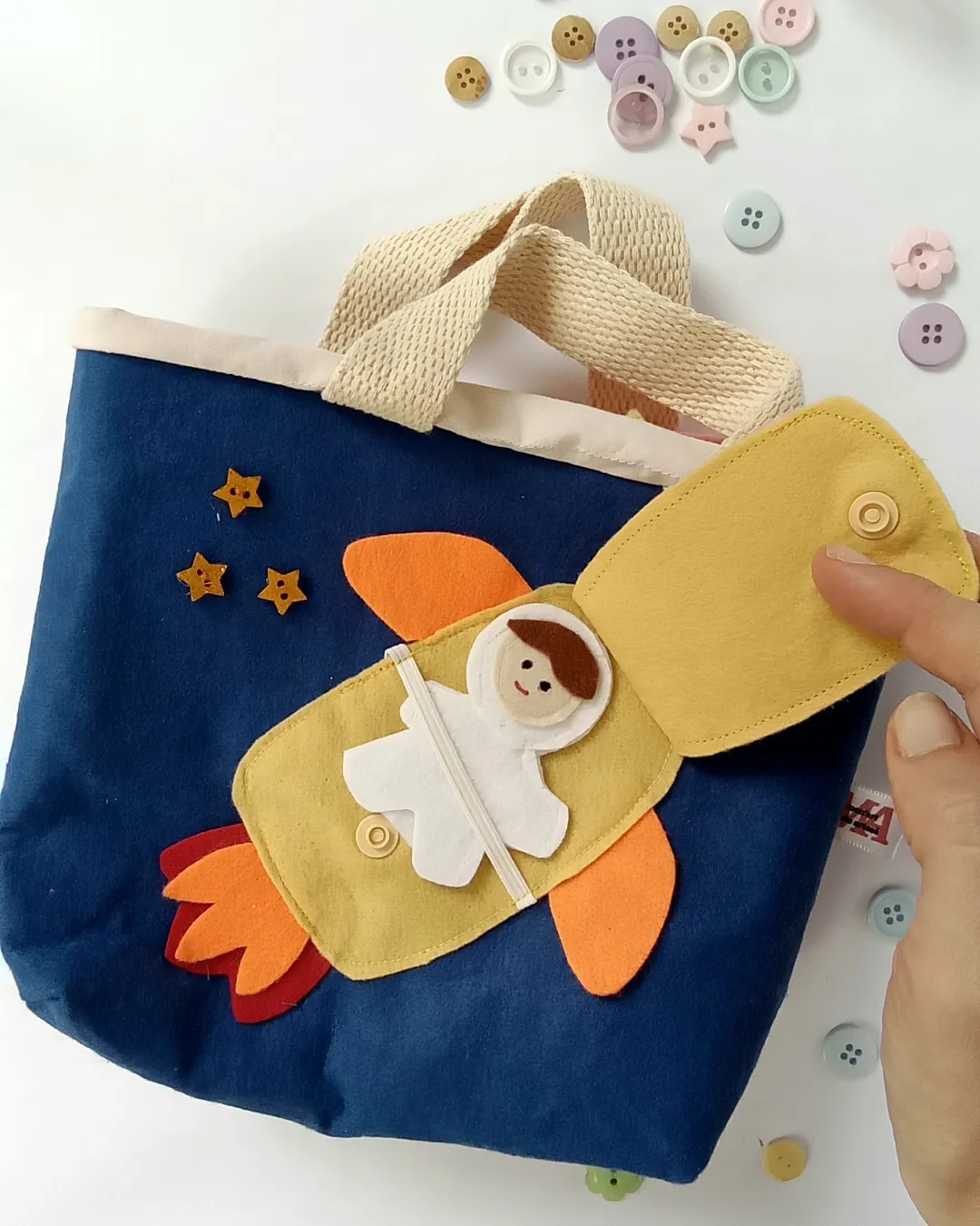 Feita em feltro com forro em algodão. Ela mede 18cm de altura, 18cm de largura e tem uma pprofundidade de 6cm. Com espaço perfeito para as 5 placas de atividades e mais alguns brinquedos divertidos.