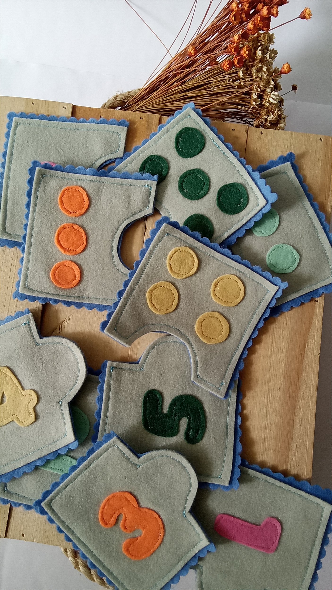 Um clássico é o jogo de quebra-cabeça que aqui é apresentado em composição com números e quantidades.